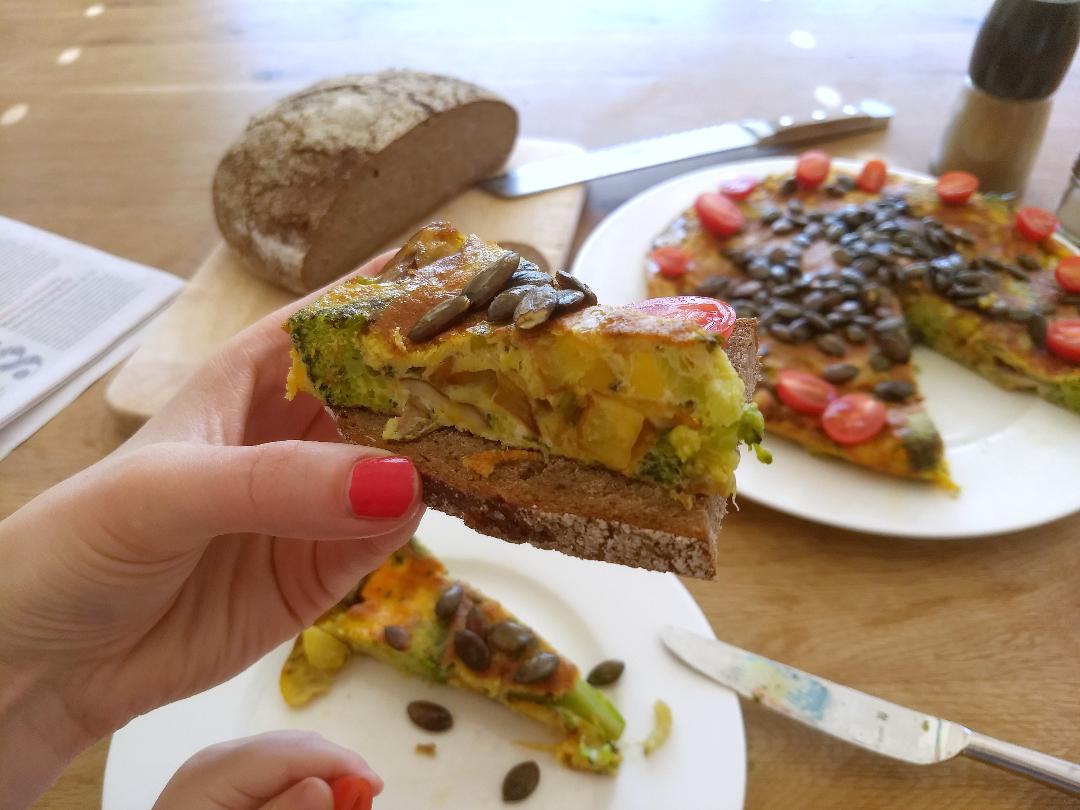 If you feel like it, you can make a Spanish tortilla for 4 people (8 eggs) using the same ingredients. In addition, dice 4 potatoes and fry in the pan with a little oil. Mix the fried vegetables and potatoes with the egg mass and fry in a frying pan over low heat (until it is barely liquid at the top anymore). Then turn everything around with the help of a large plate, let it slide in the pan and fry shortly from the other side (see photos). Is a good dish for a brunch and can be also eaten cold!