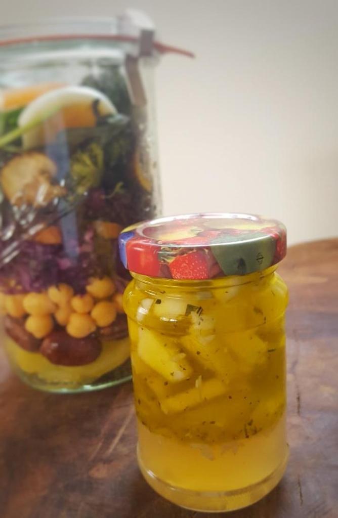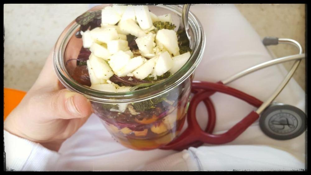 First, cover the bottom of the glass with the potato slices and add 1 tbsp of olive oil and a pinch of salt. Then in layers the other ingredients: bug beans, chickpeas, finely chopped red cabbage, sliced carrots, lentils, broccoli, mushrooms, fresh lettuce leaves. Finally, sprinkle with sunflower seeds and pumpkin seeds. Who wants it even more satisfying can put a boiled egg on top of it. Close the glass and refrigerate until you eat it. For dressing, take a small glass, add vinegar, oil and seasoned salt, as well as chopped garlic and apple cubes. Close the glass and shake.