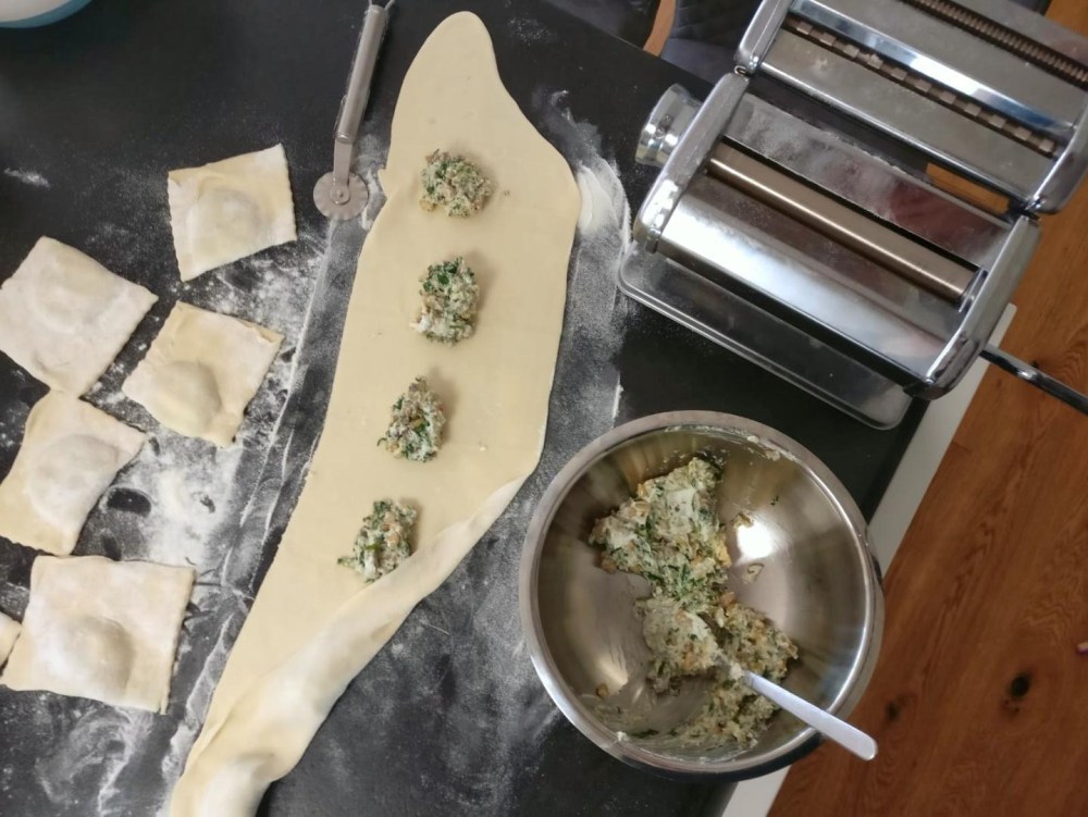 One part for me and the ravioli, and one for each girl. Everybody gets a pasta wheel (a little knife works too). Very convenient, because now they make their own food, which means I have less work and they like to eat self-made stuff a lot ;-)!
