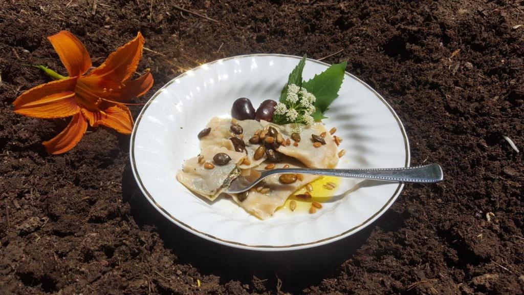 In this recipe, almost all the ingredients are spermidine-rich: the spelled whole grain flour for the pasta dough, the bug beans, the weeds and the pumpkin and sunflower seeds for the garnish. A refreshing leaf salad would also be spermidine-rich.