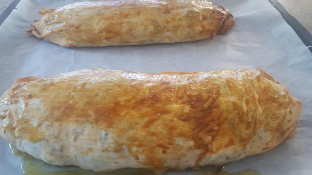 Now take out half of the strudel dough on a lightly floured tea towel, cut off the thick edges and possibly use to mend the holes that have formed in the dough. Put half of the filling on the dough and, with the help of the tea towel, roll in the strudel and place it on a sheet of baking paper. Do the same with the second. Egg wash the strudels with the rest of the egg and bake at 180 ° C for 30 min.