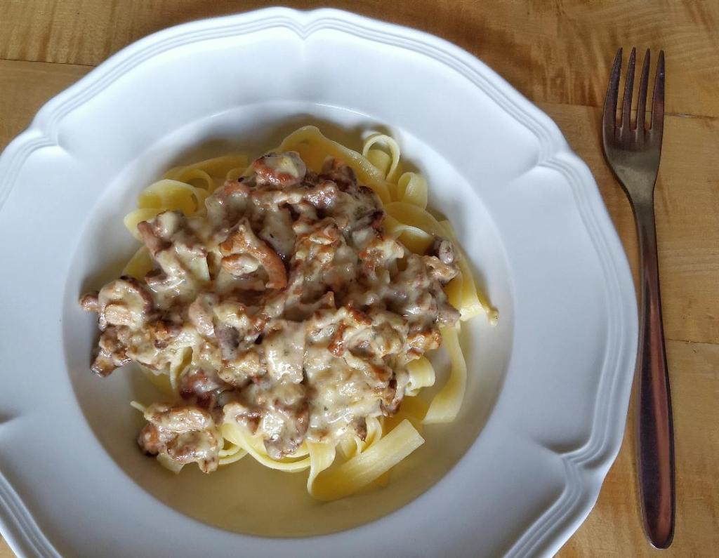 Es nächstest die Schwammerl. Wenn man die Eierschwammerl „schön“ klaubt (also schon beim Sammeln säubert). Dann brauch man sie nur einmal kurz abspülen und zum Abtrocknen auf ein Geschirrtuch schütten. Zwiebel fein Hacken und in Öl glasig anschwitzen. Trocken getupfte Eierschwammerl grob hacken und zu den Zwiebeln geben, kurz andünsten (lassen Wasser). Mit Thymian, Salz und Pfeffer abschmecken. Wenn das Wasser verkocht ist (nach ca 3 Minuten) mit Schlagsahne aufgießen kurz aufkochen lassen und von der Flamme nehmen.