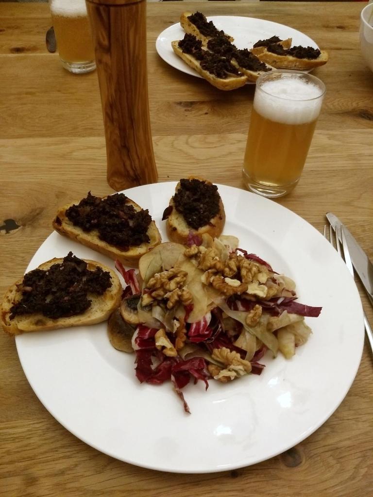 Wir genießen den Salat zu Blutwurst-Crostinis. Das ist eine schöne -einmal andere Jause-, die man zu Allerheiligen seinen Verwandten auftischen kann! Für alle Halloween Fans wäre so eine köstliche Blutwurst auch eine köstlich-schaurige Alternative zu all dem „Lebensmittelfarbe-Blut“ ;-)!