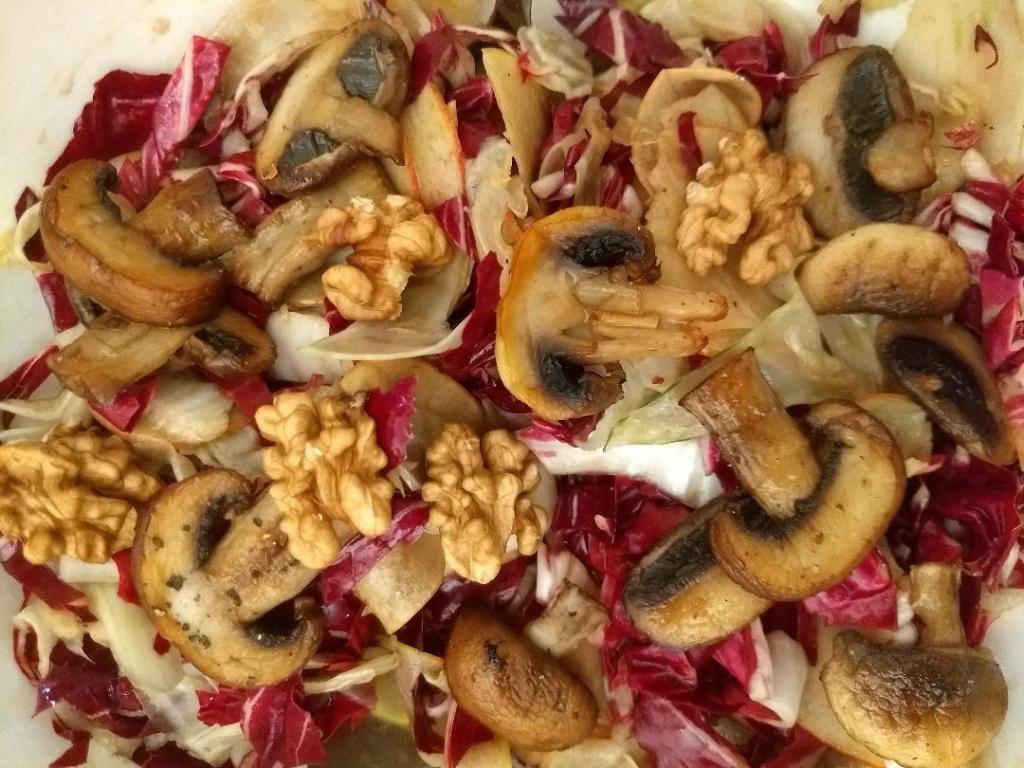Champignons in dicke Scheiben schneiden (mind. 0,5 cm) und in Öl von beiden Seiten goldbraun anbraten. Beim Radicchio nicht die Blätter abzupfen, sondern den Kopf halbieren und mit der Schnittfläche nach unten auf das Schneidebrett legen. Dann mit einem großen (scharfen) Messer den Salat in ca. 0,5 cm dicke Streifen schneiden, mit Wasser spühlen und abtropfen lassen. Den Fenchel und den Apfel in ganz dünne Scheiben (0,1 cm) hobeln.