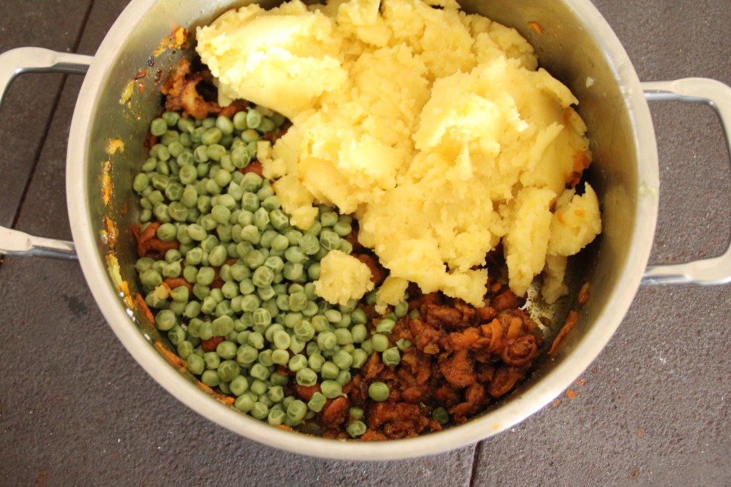 Boil the potatoes, peel and, if possible, mash them hot. Boil the peas. Chop the onion finely and steam until golden yellow. Then add grated carrot and in small pieces chopped mushrooms. Add spices to taste. It can be rather spicy. Take away from the flame, add the peas and potatoes and mix well.