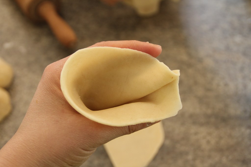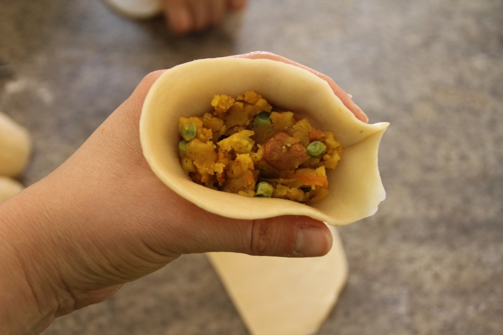 Making samosas (see also photos): Divide the dough into 6 pieces. Shape balls. Roll out each ball into a circle about 12-15 cm in diameter. Cut the circle in the middle. Brush the cut edge with water with one finger. Fold the half circle into a quarter circle and press the edges covered with water together. Hold the resulting „bag“ with the tip down in one hand and add a heaping tablespoon of filling. Brush the open edges with water at the top and press firmly together. A triangular dumpling is readyMaking to fry.