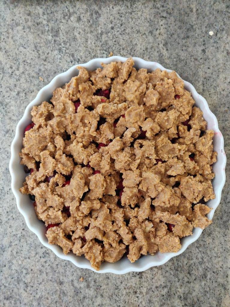 We made our crumble with red and black currants, blueberries, raspberries, wild strawberries and cherries. Of course, apples, pears, plums are also very suitable for this and you can also mix whole walnuts among the fruit, which increases the spermidine content even more.