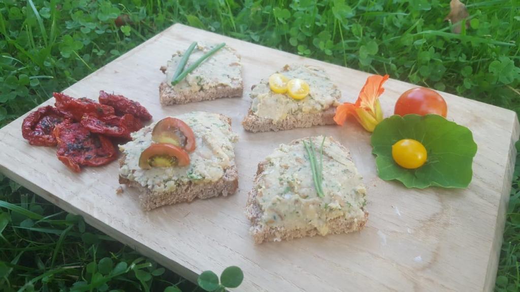Good that I had time to bake bread that day and that there is always enough self-made things for topping the bread. With all the eatable flowers and little veggis growing in the garden a „meatless bread variant“ compleated my colorful snack-plate. I have created a bread spread made from three very spermidine-rich ingredients: mushrooms, red lentils and sunflower seeds. Served on spermidine-rich wholemeal bread, the healthy breads were liked by the neighbors and could compete with the bacon and salmi bread in terms of taste.