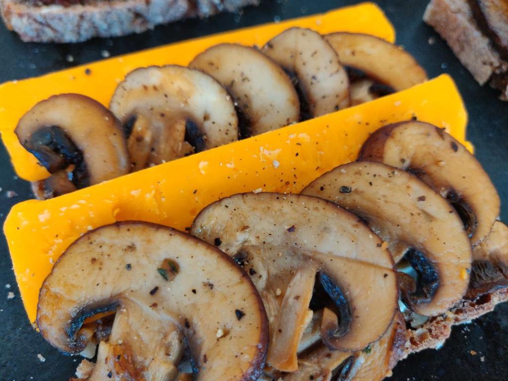 Pilze in Scheiben schneiden und in der Pfanne in etwas Öl mit Salz von beiden Seiten anbraten, bis sie appetitlich angebräunt sind. Auf die Brotscheibe etwas Butter streichen. Abwechselnd eine Scheibe Cheddar-Käse und Pilze schichten. Mit frisch gemahlenem Pfeffer würzen.
