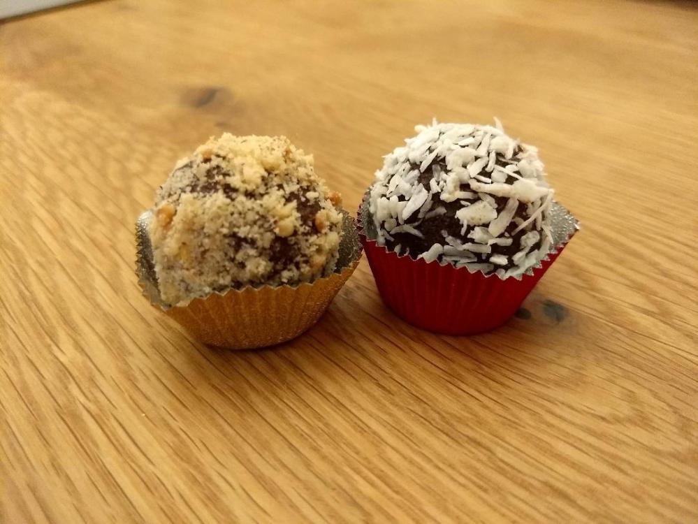 Take out the core out of the cornelian cherries (which have been soaked in schnapps since summer) and let them macerate together with the wheat-germ meal in the cherry schnapps for at least one hour. Finely grate 150 g dark chocolate (70%). Mix warm butter with icing sugar and vanilla sugar until creamy. Knead grated chocolate, cocoa, a pinch of salt and drenched Dirndln and wheat germ meal with the butter-sugar mixture. Chill for an hour. Take out portions with a teaspoon, form into a ball and roll it in coconut flakes or cocoa powder.